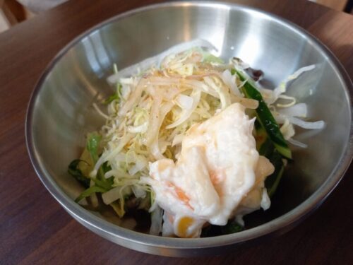 野菜サラダにマカロニ入りポテサラが乗っていて、中々のボリューム。
