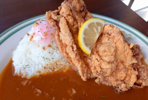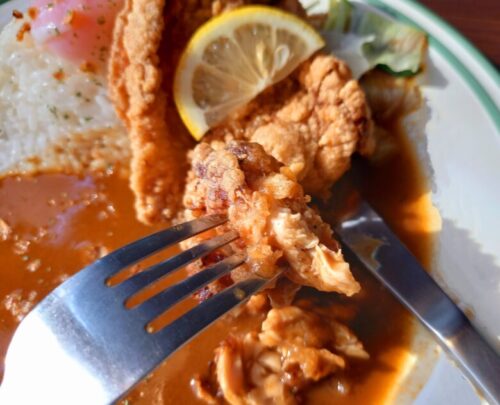 唐揚げはサックサクでボリューミー、そのまま食べてもカレーを絡めてもおいしいです。