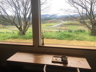 大きな窓からは、西原村ののどかな田園風景をのぞむことができ、気持ちが解放されるようです。窓の外の大きな木は、一心行の桜から株分けされた木とのことです。
