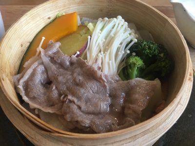 赤牛のせいろ蒸しと春野菜の天ぷらは、あとから蒸したて・揚げたてを持ってきてもらえます。