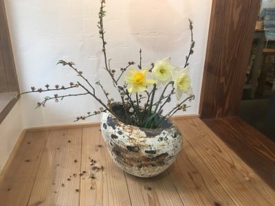 扉を開けると季節の花が出迎えてくれます。