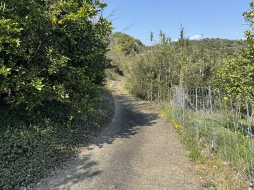 畑の道を登ります。結構足がつらくなるので、運動靴をお薦めします。