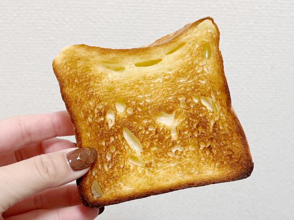 生地にたっぷりとバターが入っているのが見えるでしょうか。噛めば噛むほど、じゅわっとバターが口の中に広がります。何もつけなくても美味しくいただけます。さらにバターやジャムなどを乗せてカロリー爆弾トーストにしてもいいかもしれません。