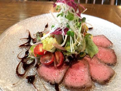 人気なのが、「あか牛のローストビーフサラダ」!お肉は貴重部位である「カイノミ」を使用しています。