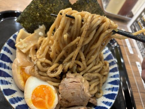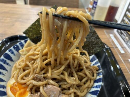 独自に製粉を配合した麺は「プリプリともちもち」のダブル食感で、しっかりとベースのにんにく醤油タレに絡んでイイ感じ。
