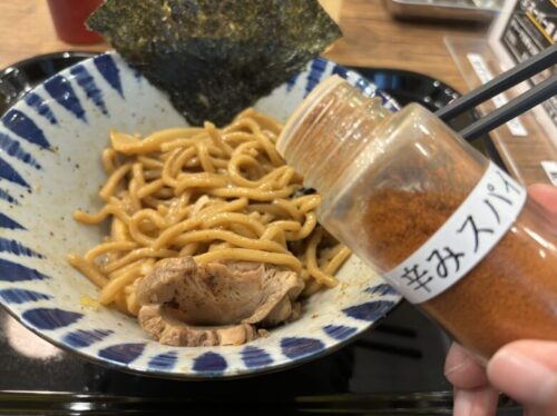 油そば店には珍しい辛味のスパイス。少量かけてみましたがかなり辛かったです。