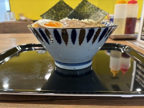 トッピングは追加で何もしていませんが、ノーマルで「玉子・メンマ・チャーシュー・海苔・ナルト・魚粉・ネギ」とかなりのボリューム!