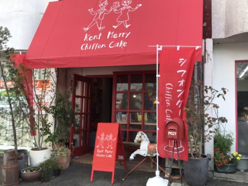 こちらが、帯山西小学校の近くにある、「Kent Merry Chiffon Cake」(ケントメリーシフォンケーキ)。シフォンケーキを持つ男女のイラストのロゴが印象的な、赤色のかわいいお店です。