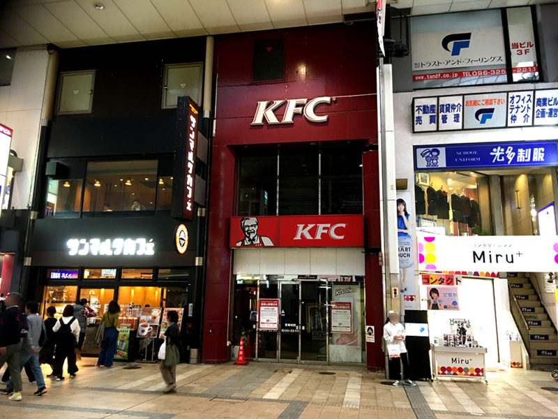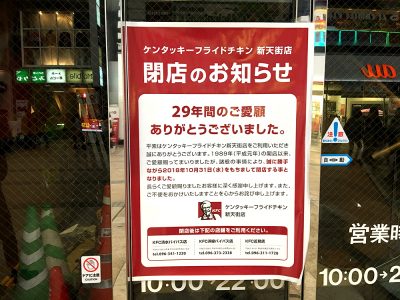 熊本市は下通アーケード内の熊本パルコの近く「ケンタッキーフライドチキン新天街店」が、10月31日(水)を持って29年間の営業を終了し閉店していました。