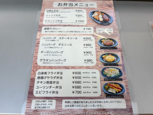 しかし、立ち退きで一旦閉店。今の場所に今年の7月に移転オープンしています。洋食屋さんだった当時と同じメニューをお弁当でいただけます。