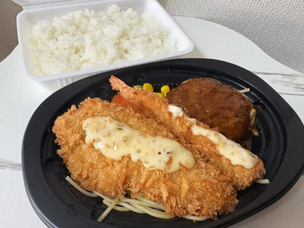 おかずはハンバーグ、海老フライ、白身魚のフライが乗っていてまるでお子様ランチのようなワクワク感があります。ただ、それでけではなく、その下にはパスタとミックスベジタブルも入っていて抜かりない。
