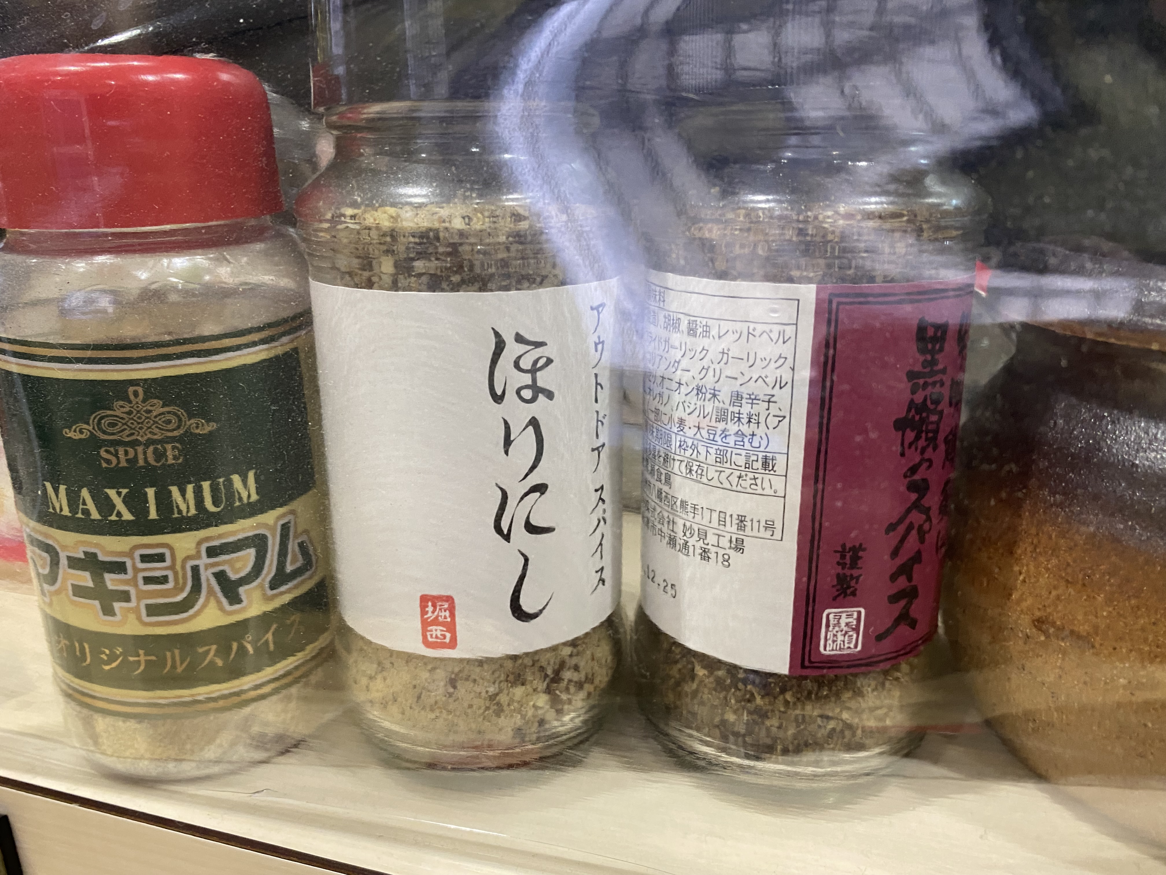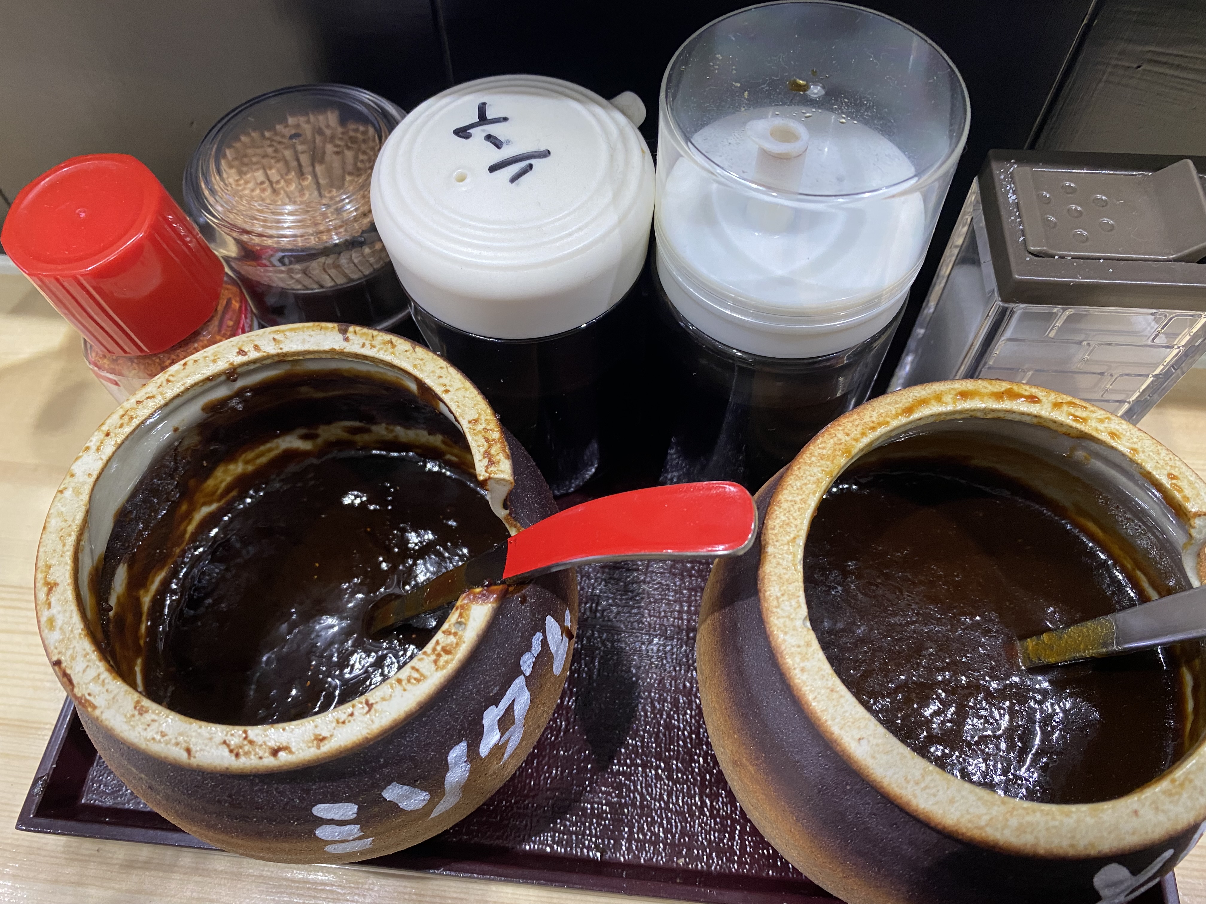テーブルには塩、しょうゆ、ソース、トンカツのタレ、ミソダレと手作りタレが並びます。