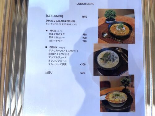 ランチは、パスタ、カレー、カレードリアがあり、単品とドリンク&サラダセットがあります。