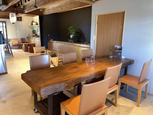 1階カフェスペースには、大きな一枚板のテーブルや、ヴィンテージの椅子やテーブルが並び、趣のある空間となっています。