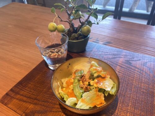 まずはセットのサラダがきましたが、お盆の上にも盆栽。
