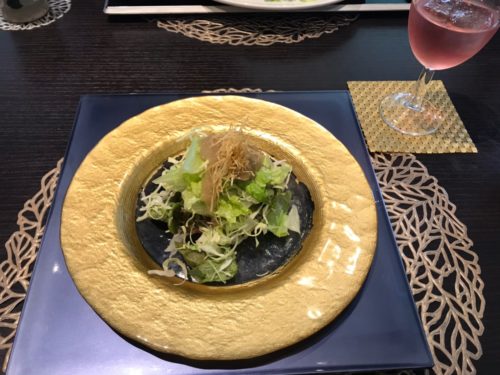 まずはぶどう酢を使ったノンアルコールカクテルとサラダ。食前にさっぱりしたお酢のドリンクを飲み、サラダから食すのは、まさしく健康的な食事!