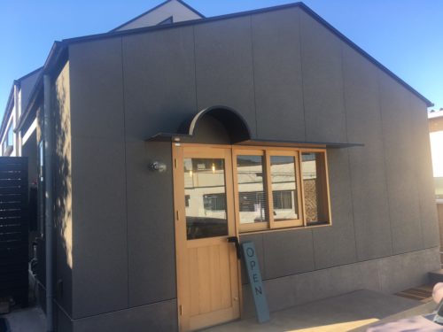 黒い外壁と木目のドアのシンプルなお店で、お店の前に駐車場が2台分あります。