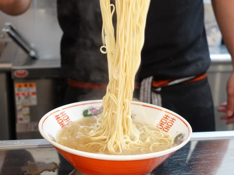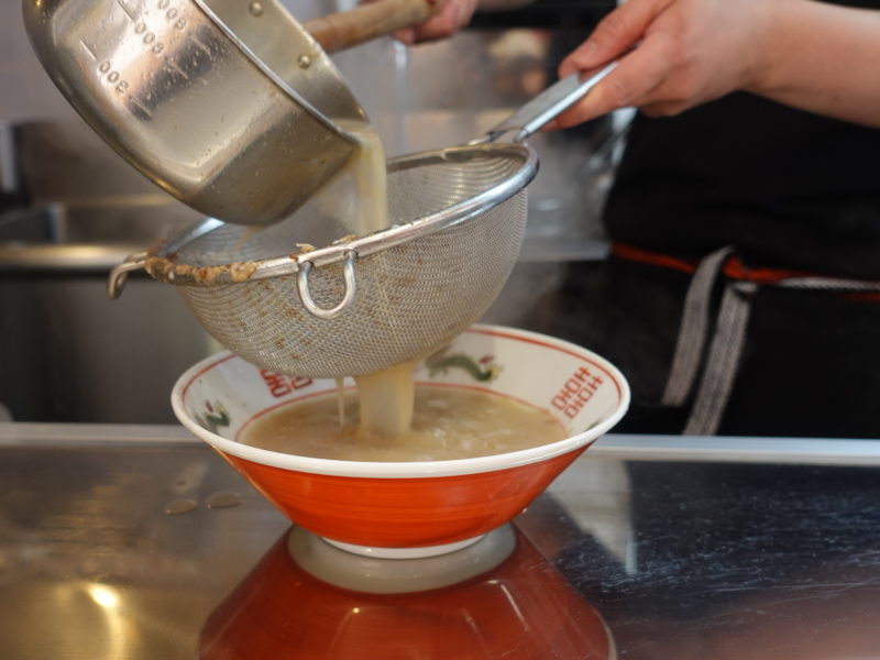 豚頭は使用せず、ゲンコツのみで炊かれたとろみと輝きのあるスープだ。