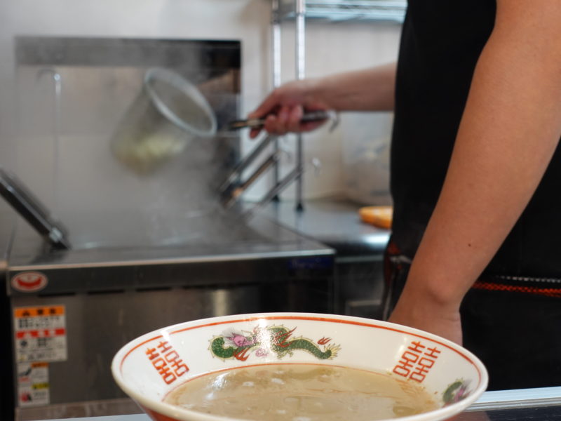 立ち昇る湯気と共に、上品な豚骨の香りが店内に広がります。