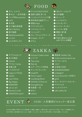 公式のフライヤーには出店者さんがずらりと並んでいます。ついんすたー、イルフォルノドーロ、カフェココペリ、ママトコキッチン、にんぐるカフェは以前、肥後ジャーナルでも取り上げました。その他のお店も各地のマルシェで話題になっている魅力的なお店ばかりです!