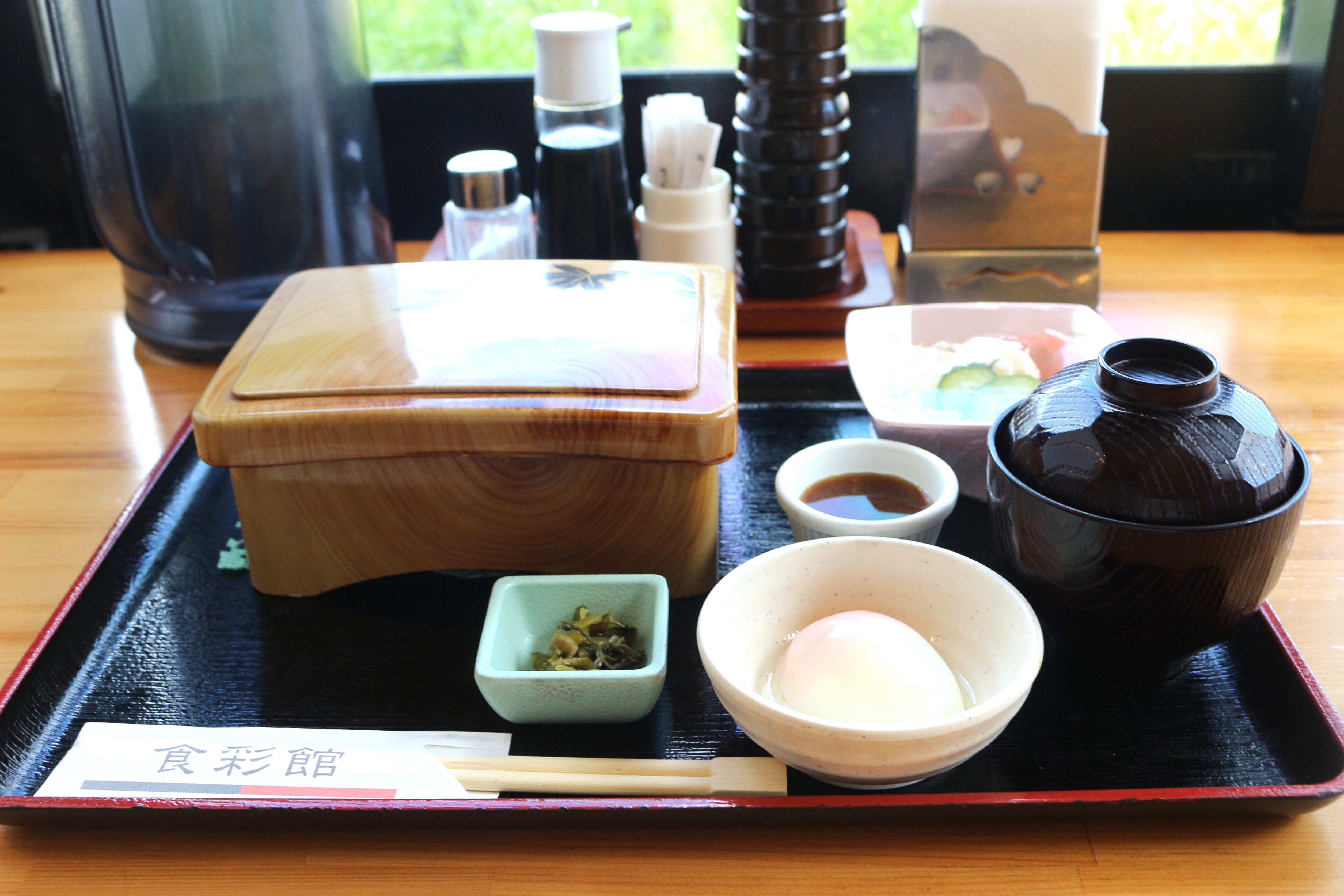 とにかくお肉を堪能したい私が頼んだのは上ロース重セット(1980円)。旭志牛の上ロース重に漬物、味噌汁、温玉、サラダ付き。待ちきれないので早速食べていきます!