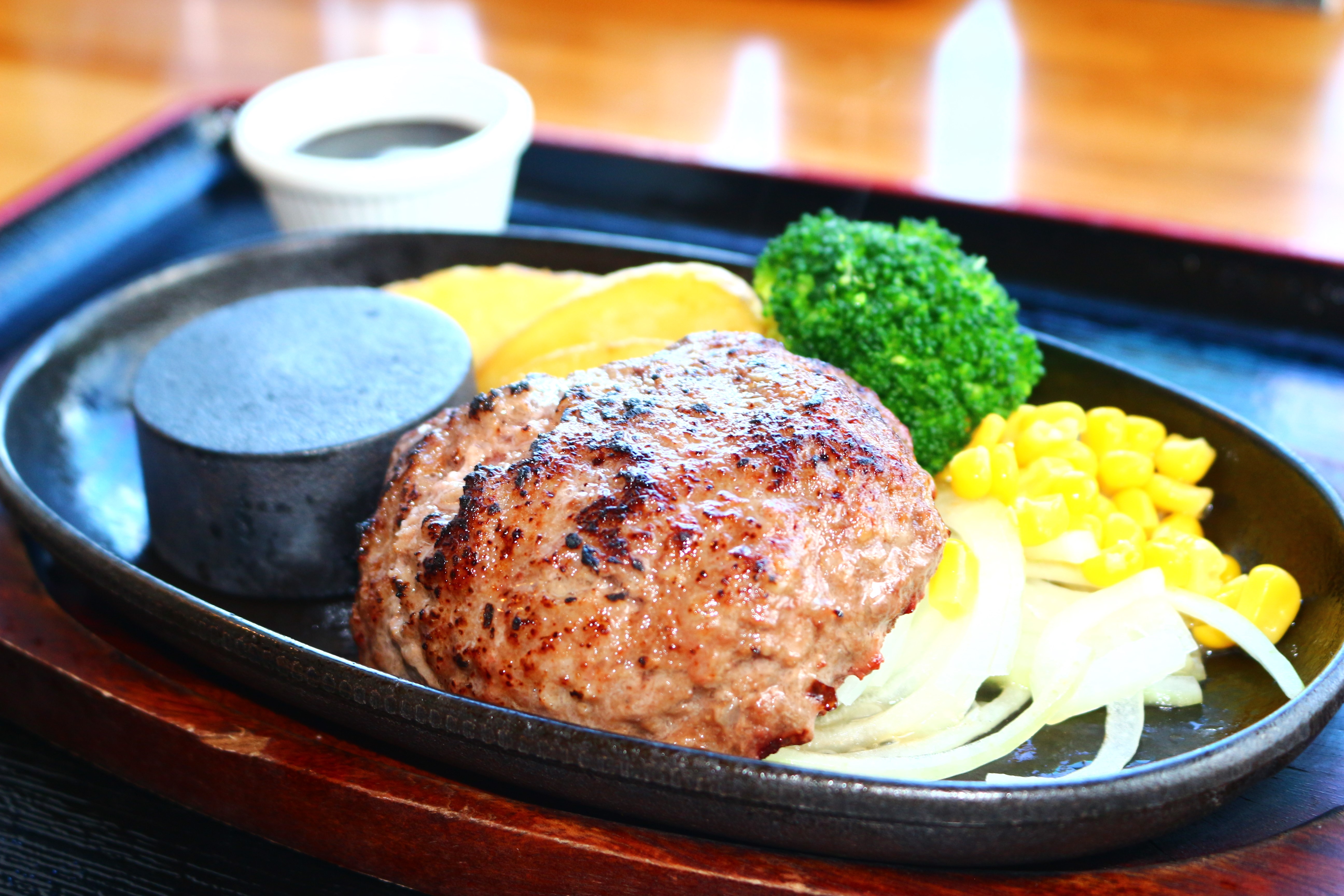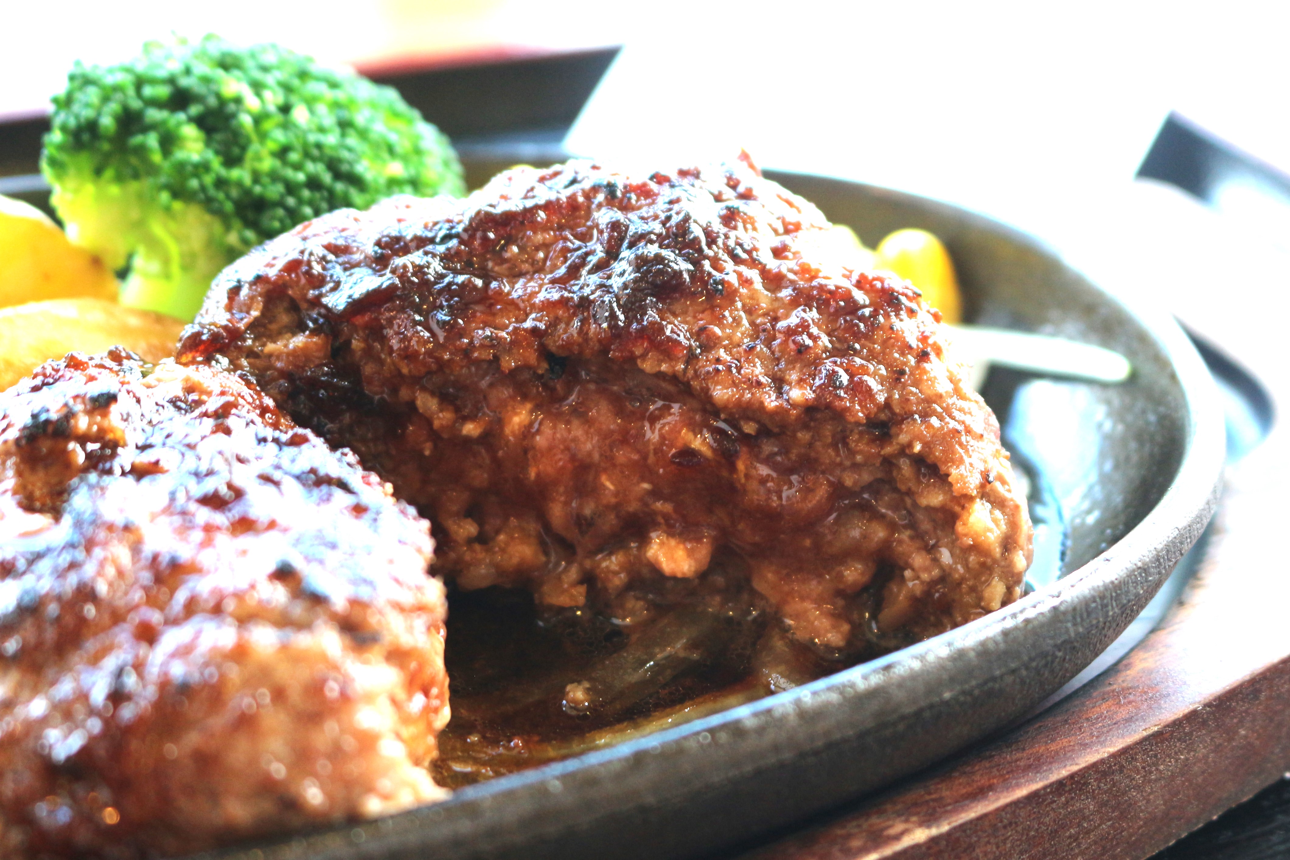 旭志牛100%の贅沢なハンバーグは、丁寧にお肉を三度挽きされていて柔らかいのが特徴。中がレアの状態で出てくるので、鉄板の上でお好みの焼き加減で食べます。