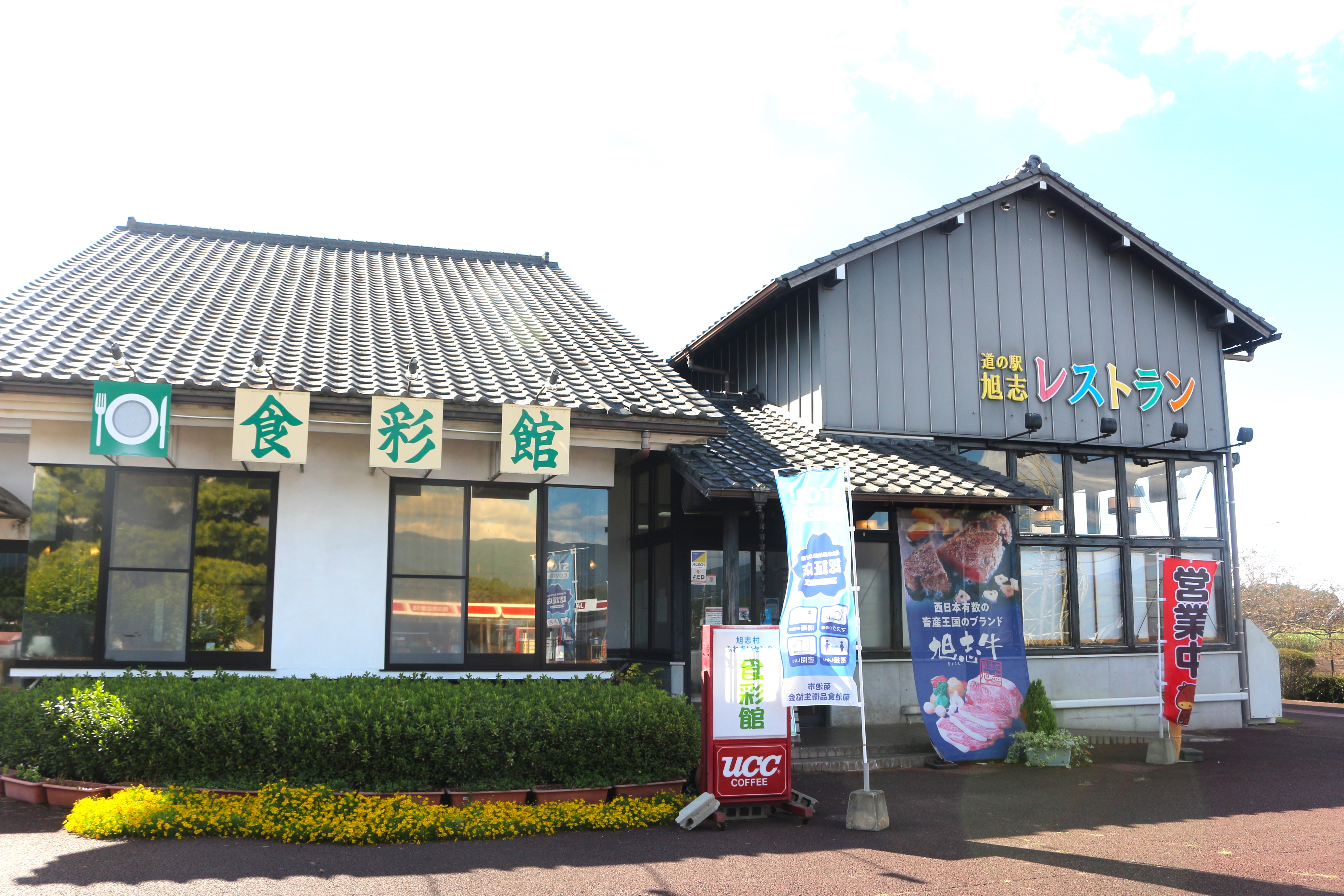 「道の駅 旭志」の敷地内にあるレストラン「食彩館」へ。表に大きく、菊池市のブランド牛の旭志牛の文字。これは期待大!さっそく入っていきます。