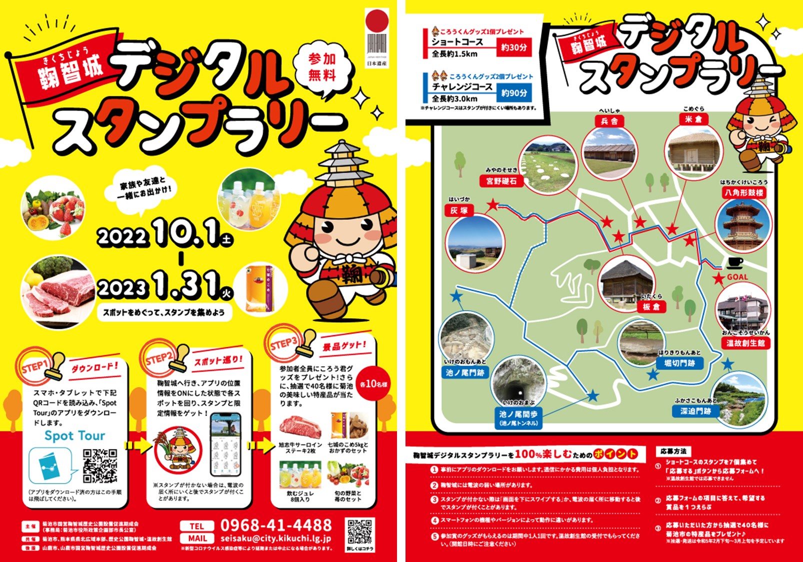 スタンプを集めると、鞠智城イメージキャラクターころう君のグッズがもらえます。さらに、『旭志牛サーロインステーキ』や『七城のお米』が当たる抽選にも参加できます。運動にもなるし、美味しいものをもらえるチャンスもあって一石二鳥!