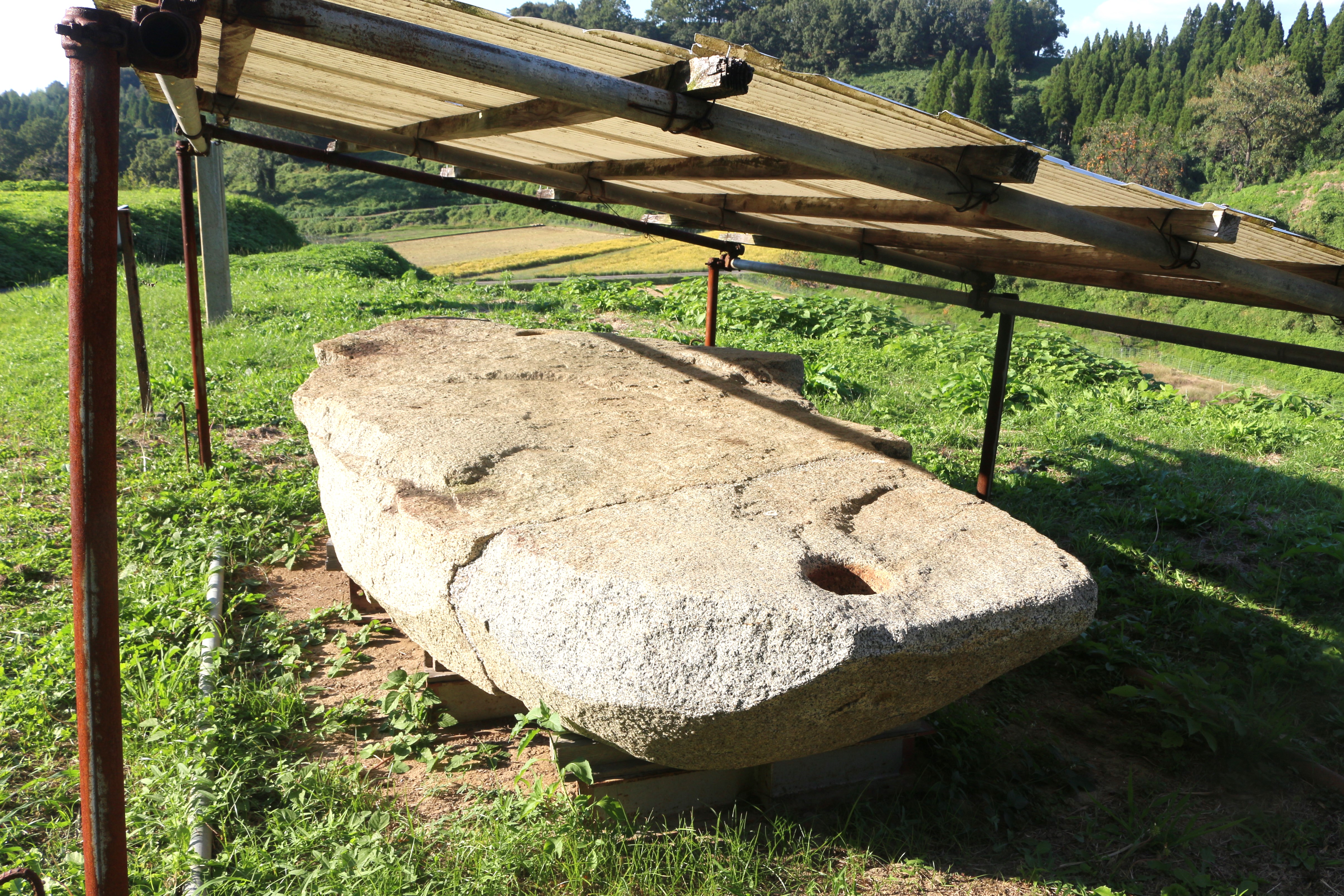 大きな石?なんですが、よく見てみると両側に2つの穴。当時、鞠智城へ入る門の土台として使われていて、この2つの穴に門の柱が立っていたそう。通常、土台は柱1つにつき1つの場合が多く、このようになっているのは珍しいらしい。