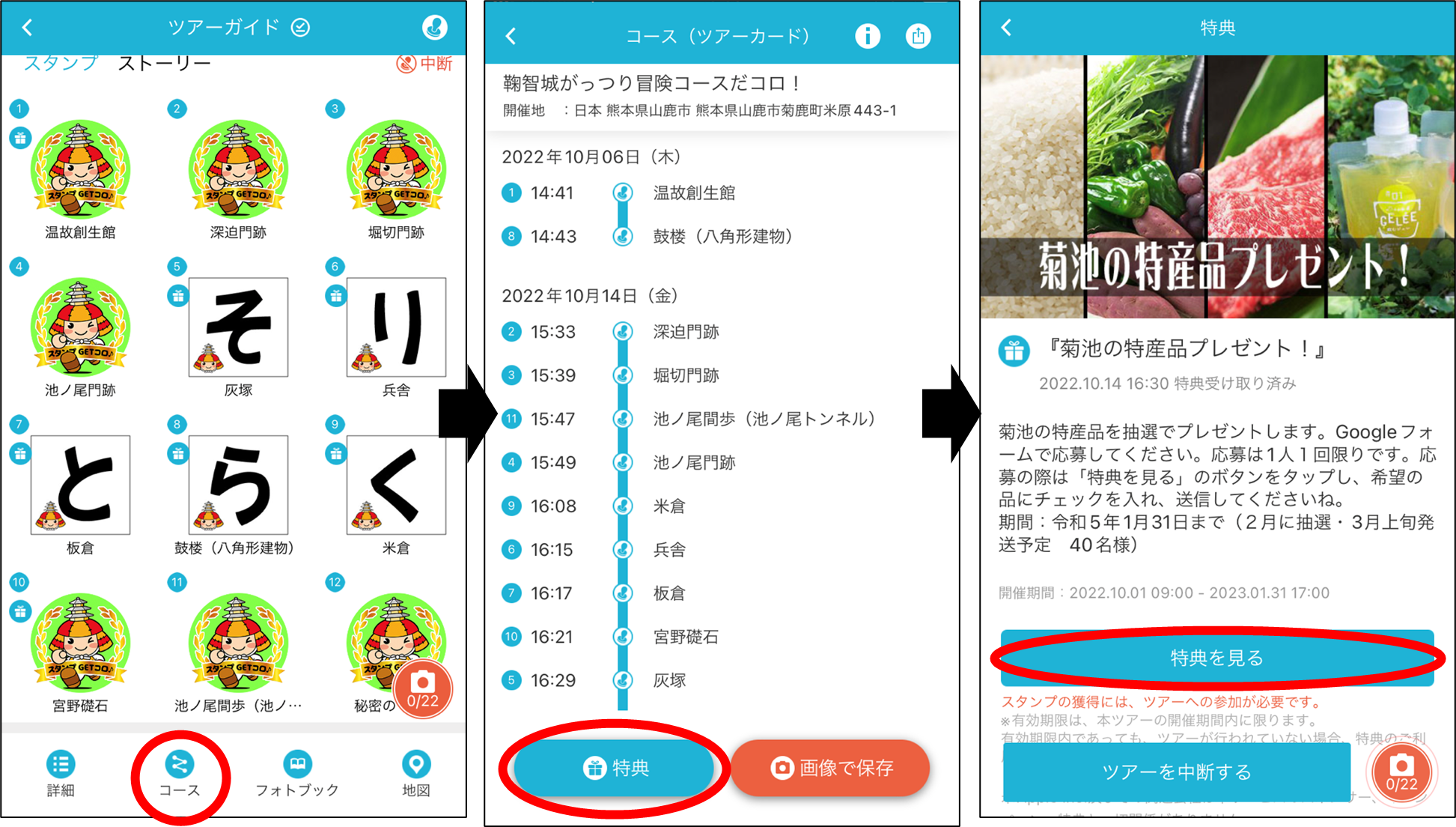 アプリをダウンロードして開くと、この画面に。選ぶのは【鞠智城がっつり冒険コースだコロ!】です。