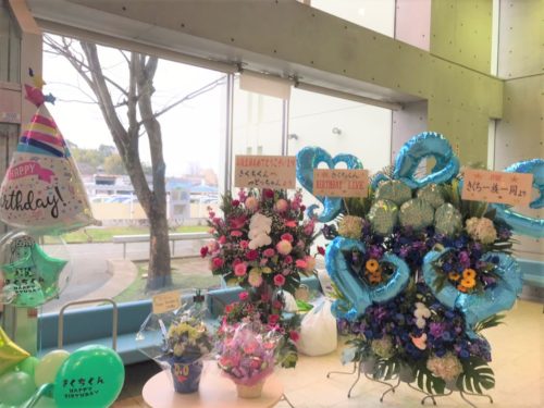 入口付近は、ファンや関係者からのたくさんのお花やバルーン、誕生日プレゼントなどでいっぱい!