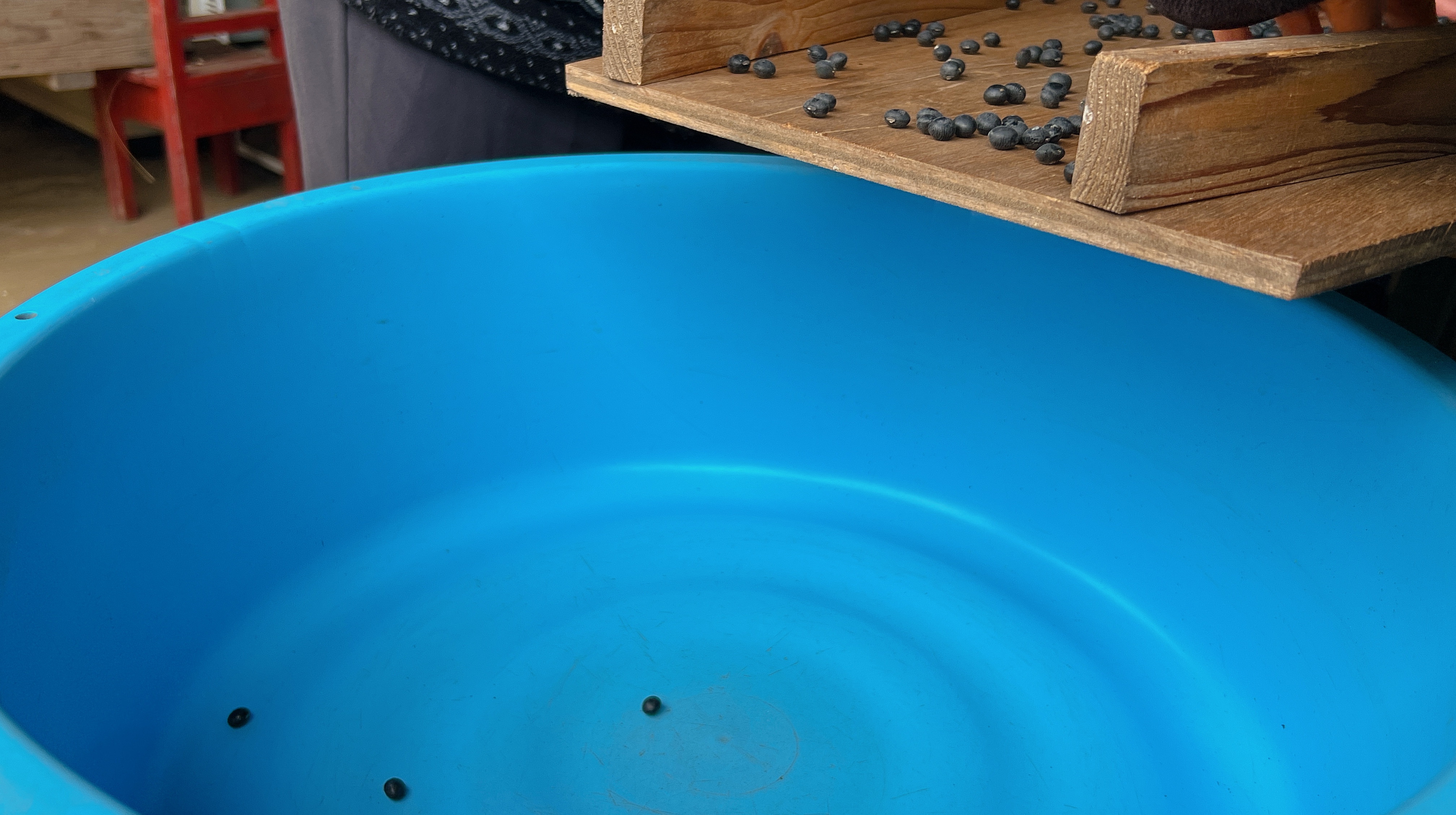 台の上に豆を広げ、割れているものなどを取り除いて行きます。