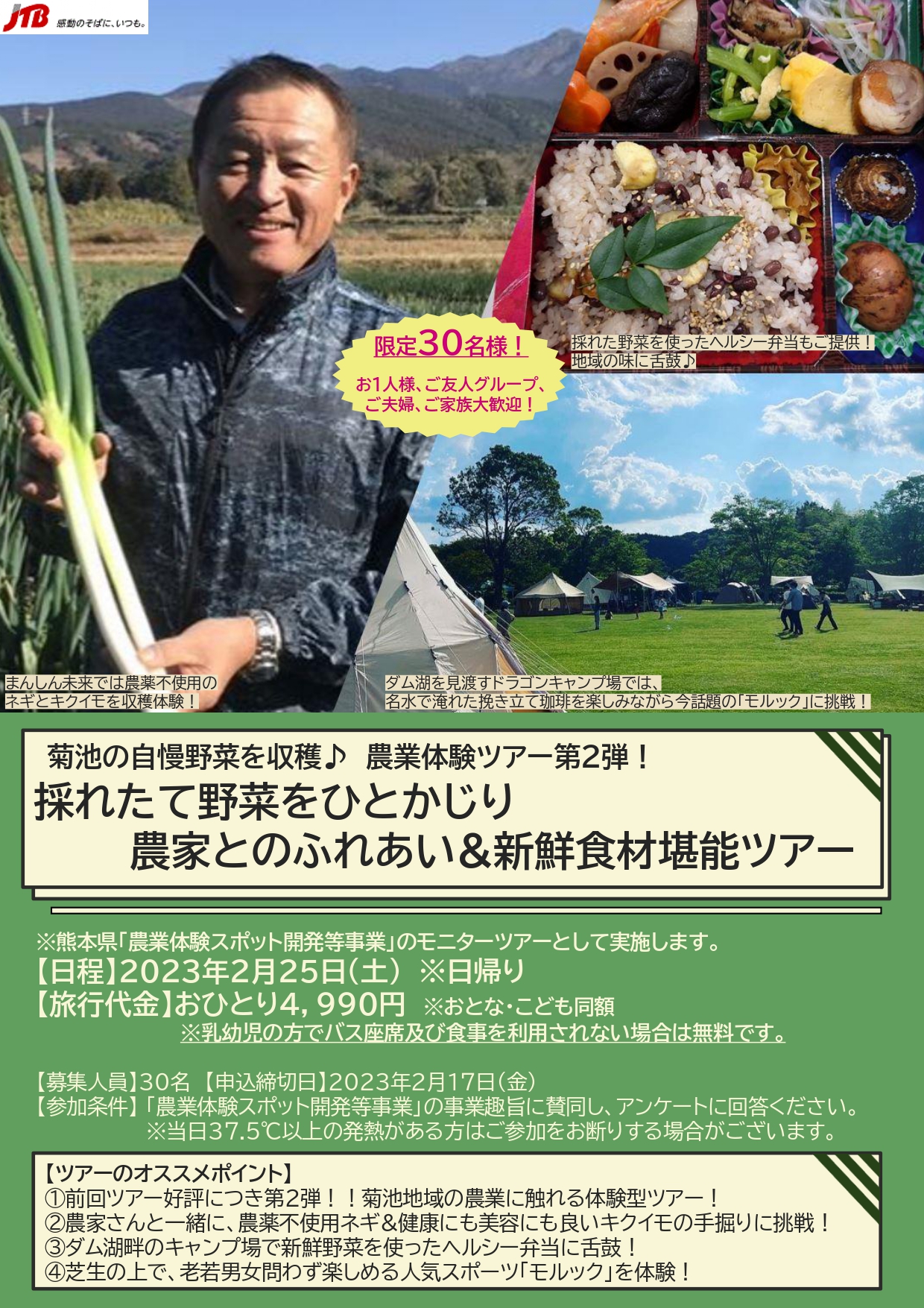 内容も、無農薬ネギの収穫体験、菊イモの手掘り体験、竜門ダム近くのドラゴンキャンプ場でお弁当、モルック体験など