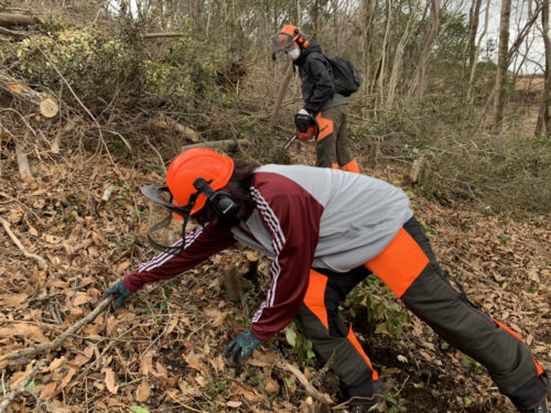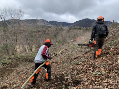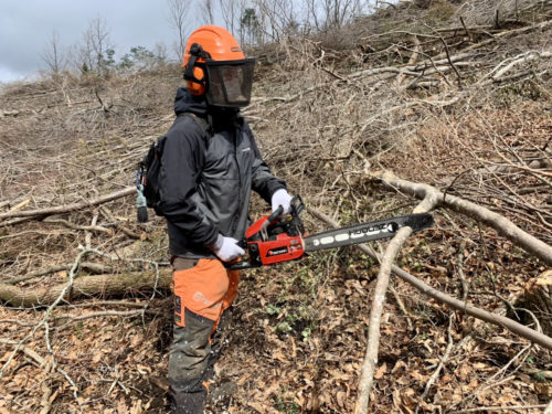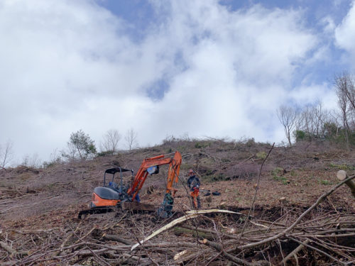 「今日の仕事は地(ぢ)ごしらえです。伐採した木の枝などを取り除いて整地する作業です」