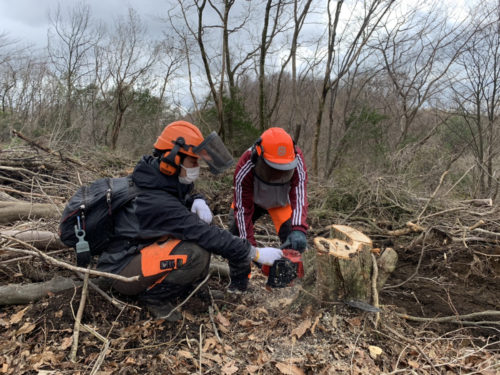 本当に危険を伴う作業のため、先輩に手ほどきを受けながら、すでに切り株状態の木を切ってみます。
