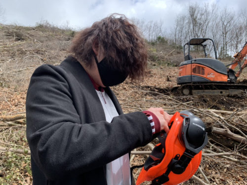 整備班の班長さんに「葉加瀬太郎が来たのかと思った」と突っ込まれつつ、チェーンソーの刃から身を守るためのボトムカバーとヘルメットをお借りします。