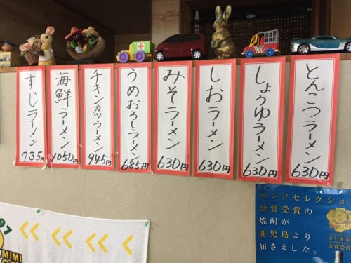 壁にもラーメンのメニューが掲示してあり、とんこつ、みそ、しょうゆなど、どんな味でもいけます。