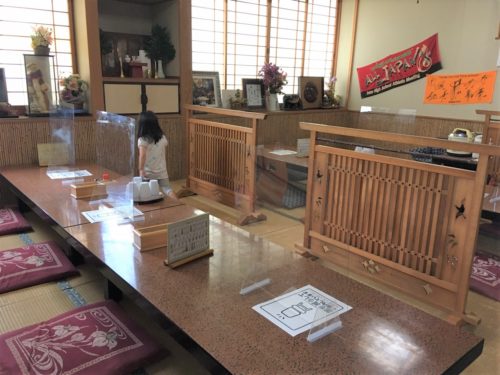 入口は2ヶ所あり、左側には御食事処の暖簾、右側にはラーメンの暖簾がかけられています。