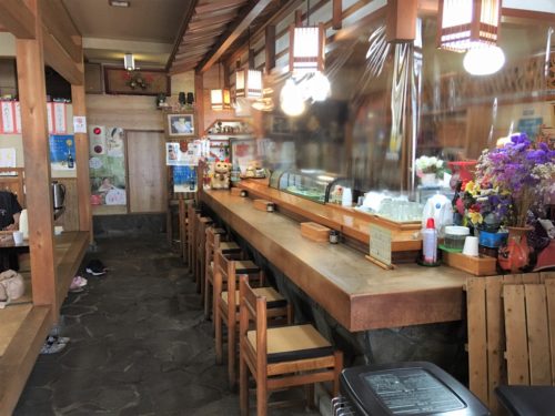 左側の御食事所の入口から入ったところ、中はお寿司屋さん風のカウンターとお座敷。