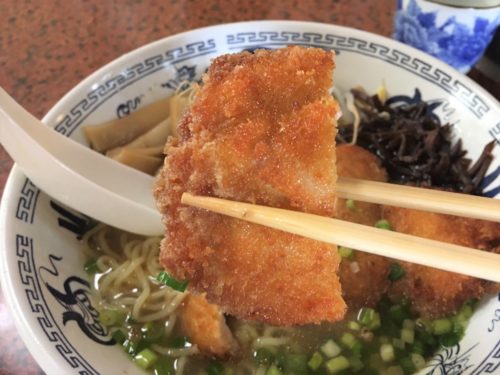醤油ベースのラーメンの上に、熱々ジューシーなチキンカツが