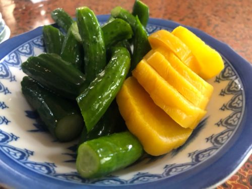 気になっていたチキンカツラーメンをオーダーした後、まず出てきたのが、山盛りの沢庵ときゅうり。