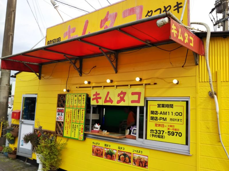 肥後銀行楠支店の隣にある「キムタコ 楠店」。小さい店舗ながら黄色が映えて目立つお店です。