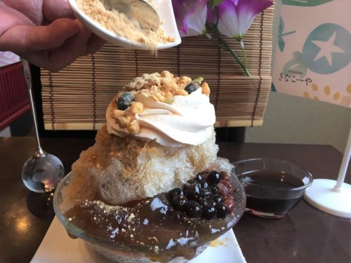 きなこクリームやきなこグラノーラのトッピングに、あずき、タピオカ、わらびもちが添えられていて、さらに黒みつときな粉がついてきます。そして、氷の中にはきな粉ソフトクリームまで入っているという、豪華すぎるかき氷!