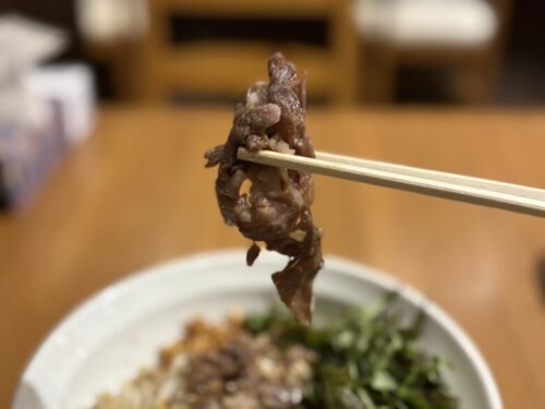 お肉に加えて、野菜もたっぷりなので罪悪感がありません。フライドオニオンがジャンキー感をプラスしてくれるので満足度が高い1杯です。