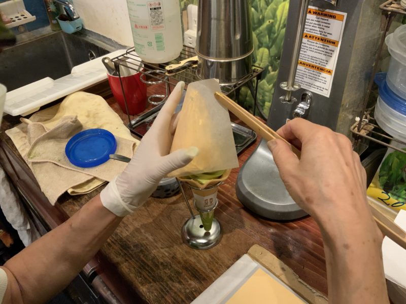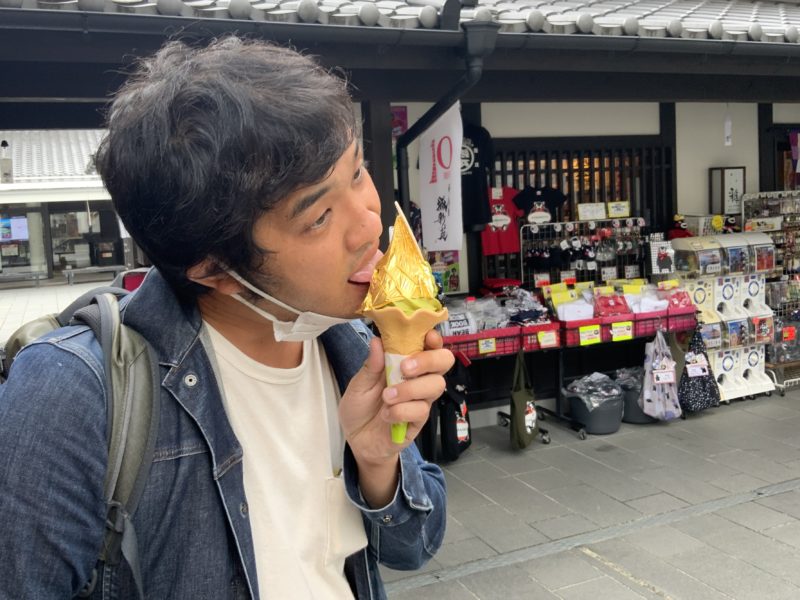 そんな抹茶ソフトクリームにペタっと金箔を貼り付けていきます。これもべらぼーに高価なんだとか。なので金箔ソフトって京都とかにも多いらしいですけど、1000円以下で提供しているところは少ないそうです。