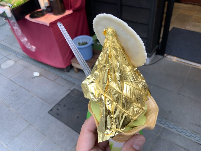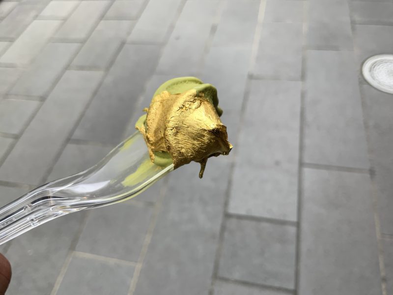 抹茶ソフトクリームに光り輝く金箔をペタリ