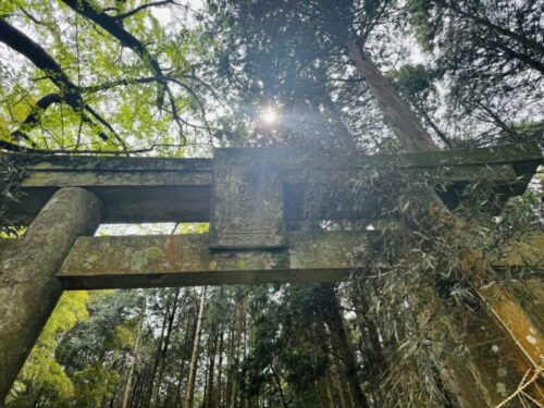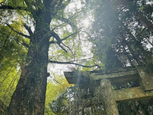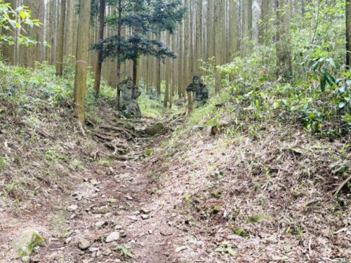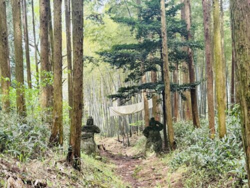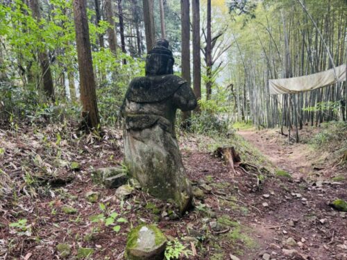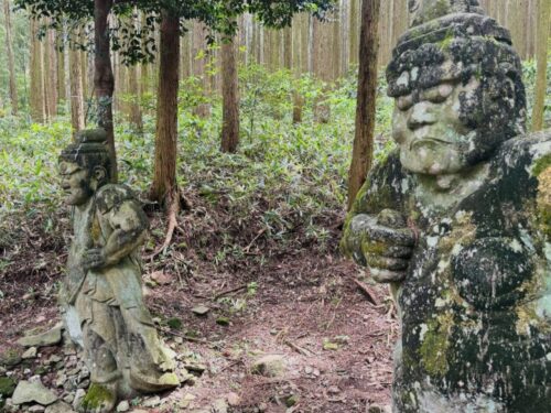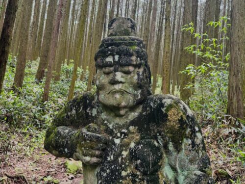 また来ますね、と振り返ると、真っ直ぐとした木々に埋もれるように、二つの顔が。この日は道に木も倒れておらず、とてもきれいな状態で見られましたが、雨風の日の後などは、たどり着けるかすら不明です。