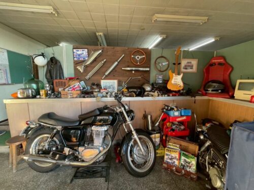 店内に入ると目の前に飛び込んでくるのは、昔のバイクやギター、雑貨類。