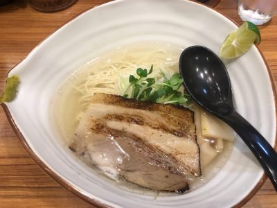 透き通った旨味たっぷりの塩スープに、柚子胡椒とすだちをきかせ、さっぱりと食べられる鯛塩ラーメン。