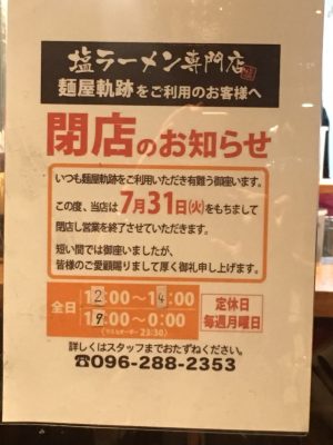 藤崎宮近くの南坪井町にあった塩ラーメン専門店「麺屋軌跡」。こちらが2018年7月31日をもって閉店となりました。